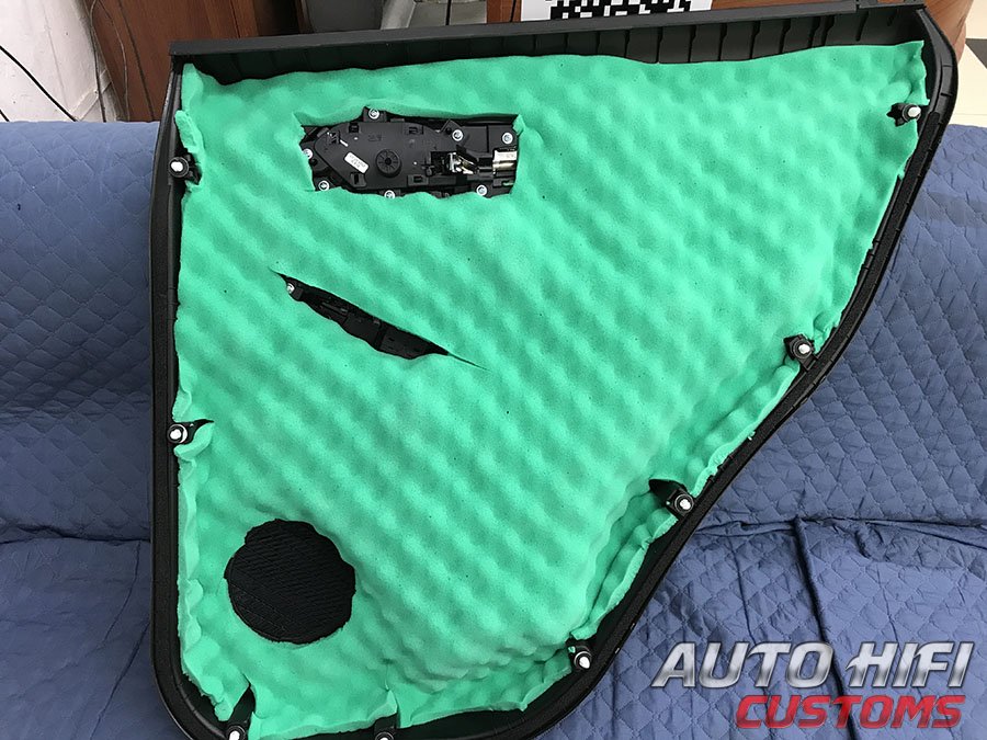 Перед установкой дверных накладок на свои места, наклеили под них толстый и эффективный шумоизолятор.