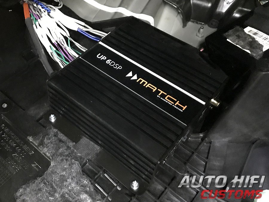Немецкий процессорный усилитель мощности Match UP 6DSP установили за пластиковый щит в ноги переднего пассажира MB W213 и подключили к штатному головному устройству. Пару мощных каналов подключили к вуферам в ногах водителя и пассажира. Настроили срезы частот, выставили временную коррекцию и подкорректировали АХЧ эквалайзером. Зазвучало классно! |