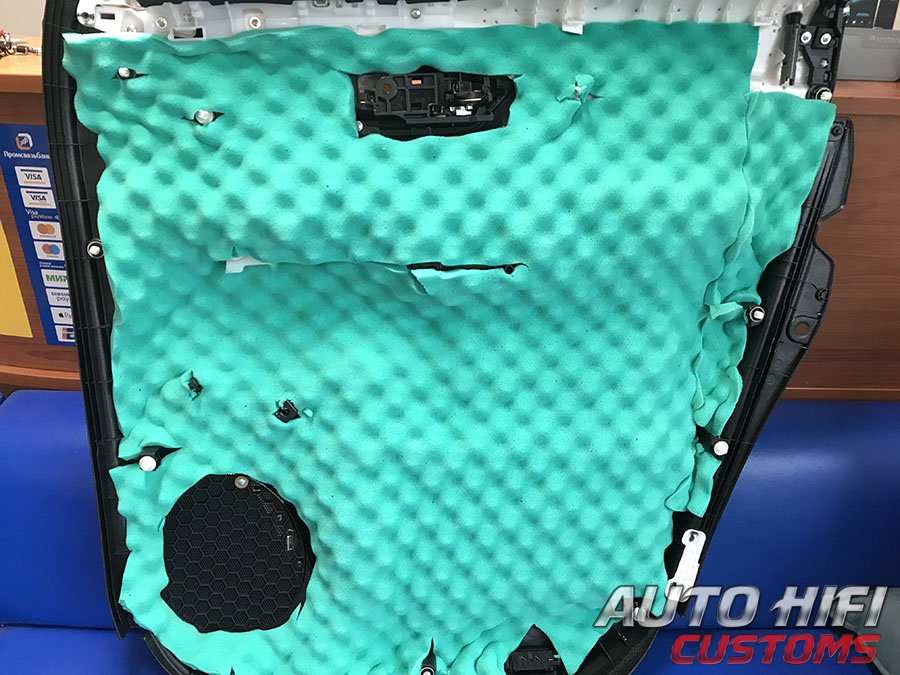 Перед установкой дверных карт на свои места, наклеили под них толстый и эффективный шумоизолятор.