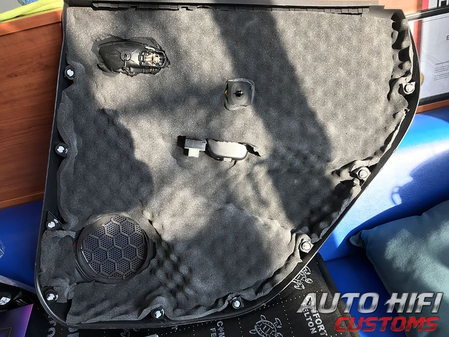 Перед установкой дверных накладок на свои места, наклеили под них толстый и эффективный шумоизолятор.