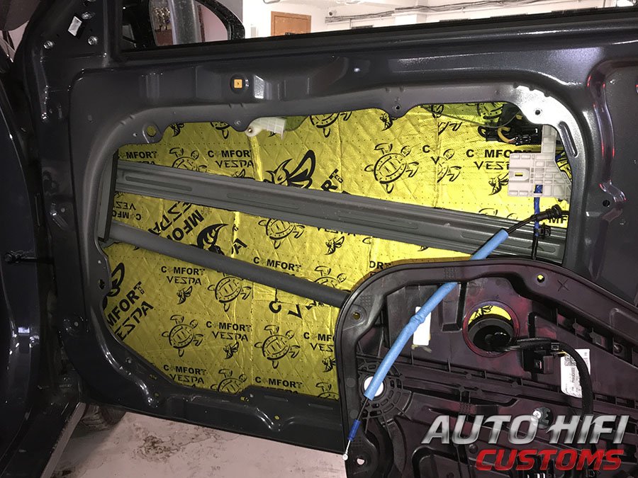 Дверные накладки и щиты аккуратно демонтировали, наружный металл обезжирили и виброизолировали.