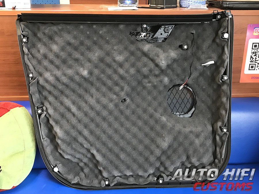 Перед установкой дверных карт на свои места, наклеили под них толстый и эффективный шумоизолятор.