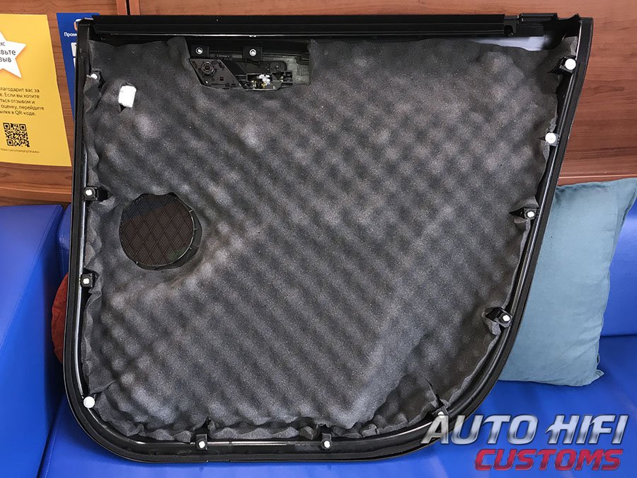 Перед установкой дверных карт на свои места, наклеили под них толстый и эффективный шумоизолятор.