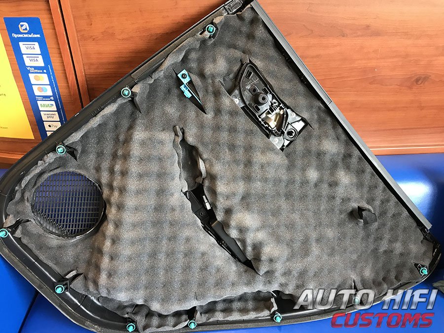 Перед установкой дверных накладок на свои места, наклеили под них толстый и эффективный шумоизолятор.