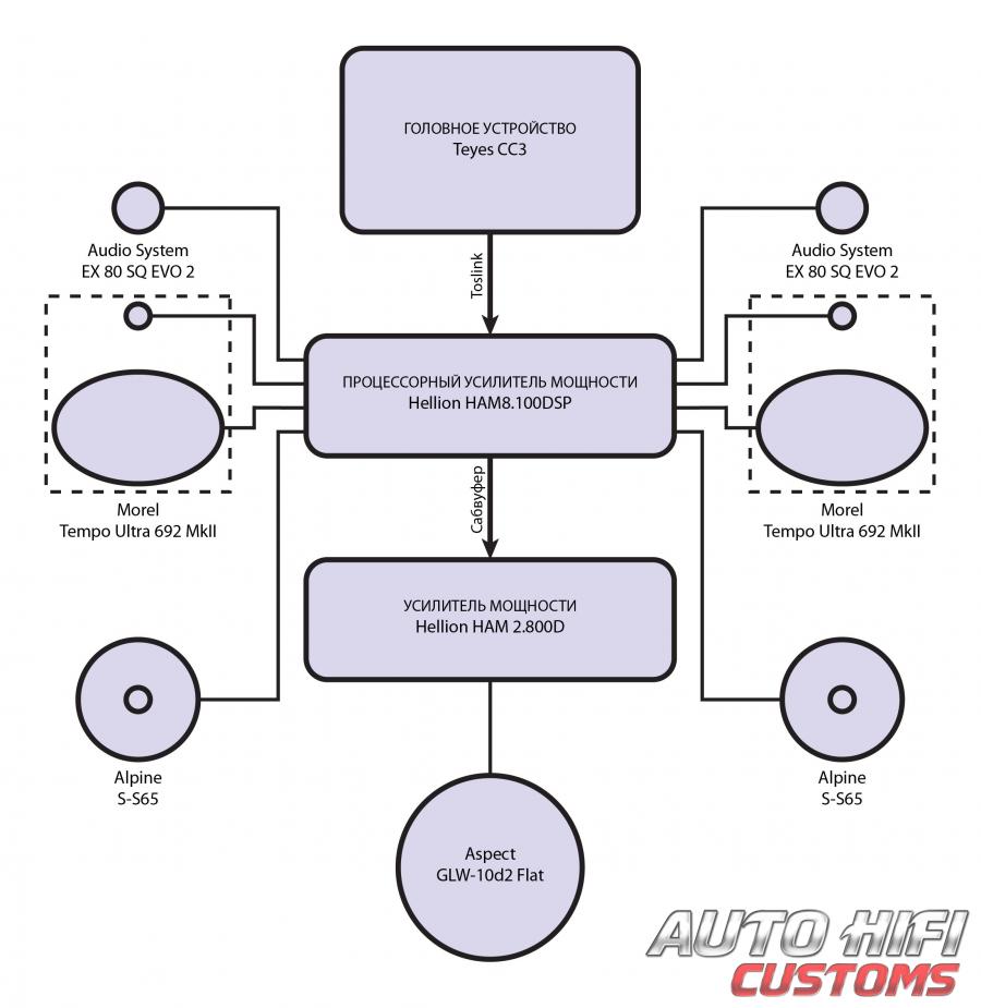 - Акустика: Morel Tempo Ultra 692 MkII, Audio System EX 80 SQ EVO2, Alpine S-S65