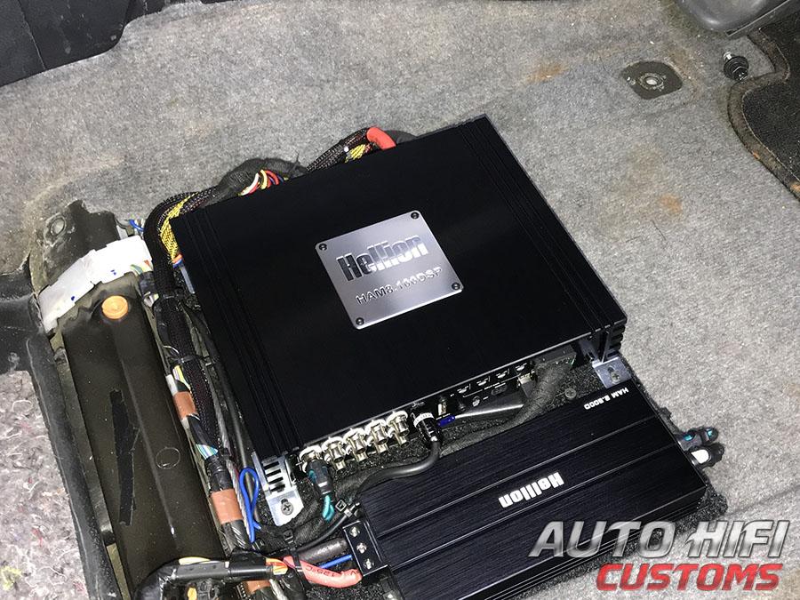 С новой автомагнитолы взяли цифровой оптический сигнал и подали в процессорный усилитель Hellion HAM8.100DSP, который установили под переднее сидение автомобиля. Процеусь позволит нам реализовать поканалку в 3-компонентной фронтальной аудиосистеме, усилить тыл, а также задать параметры звучания сабового звена через дополнительный усилитель.