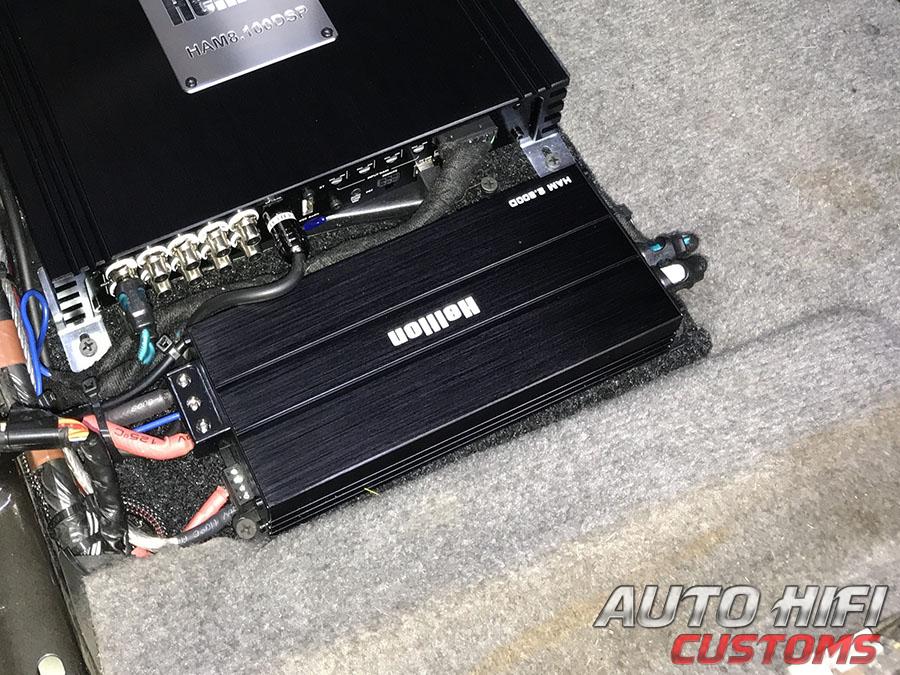 2-канальный усилитель мощности Hellion HAM 2.800D с хорошим запасом мощности для сабвуфера отлично встал рядом с процеусем аудиосистемы под переднее сидение Toyota Land Cruiser 120.
