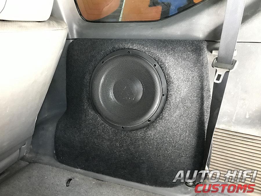 Сабвуферный динамик Aspect GLW-10d2 Flat установили в изготовленный для него корпус типа «стелс» в правой боковине багажника. Диффузор динамика защитили от повреждений надежным металлическим грилем, полезное место не пострадало, а в аудиосистеме будет четкий и насыщенный бас.