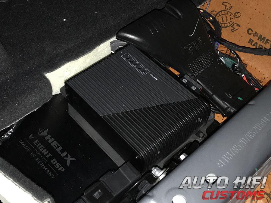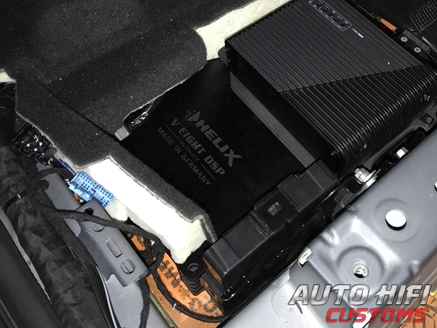 После головного устройства стоит штатный усилитель, к которому мы и подключили сердце новой аудиосистемы - процессорный усилитель мощности Helix NEXT V EIGHT DSP ULTIMATE, установив его в подпол багажника. У процеуся на борту 12 входов высокого уровня, которые обрабатывают сигнал амплитудой до 32 вольт, что позволяет его эффективно использовать в любых современных автомобилях.