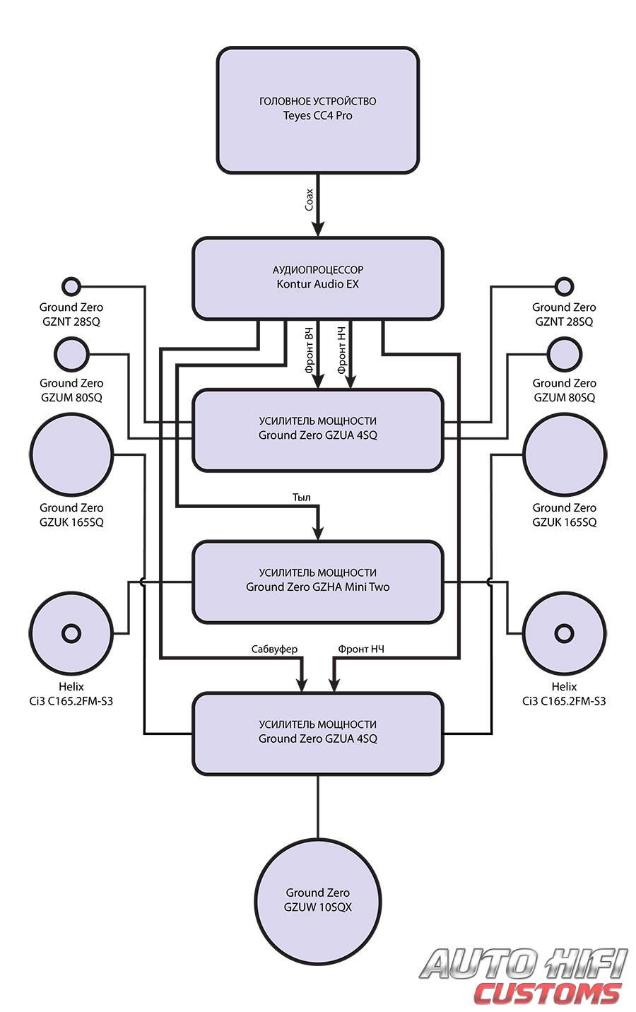 - Акустика: Ground Zero GZNT 28SQ, Ground Zero GZUM 80SQ, Ground Zero GZUK 165SQ, Helix Ci3 C165.2FM-S3