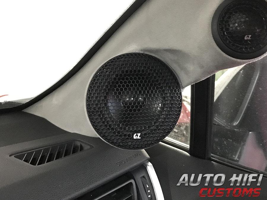 Шелковые высокочастотники Ground Zero GZNT 28SQ и детальные среднечастотники Ground Zero GZUM 80SQ установили на фронт в переделанные передние стойки Toyota RAV4 пятого поколения с направлением на слушателей.