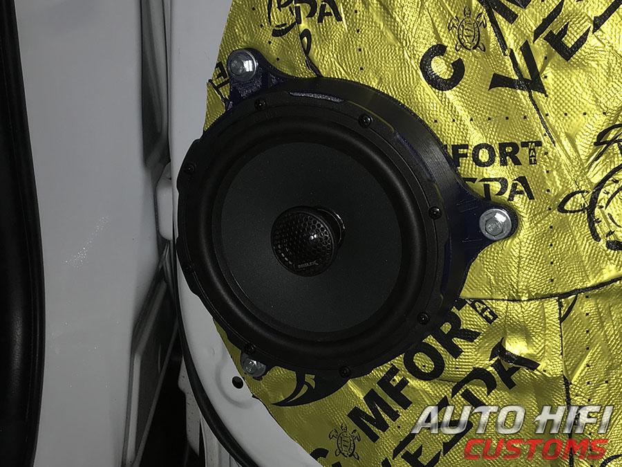 Немецкие панчевые мидбасы Ground Zero GZUK 165SQ установили на фронт в штатные места подготовленных материалами Комфорт Мат передних дверей Toyota RAV4.5 с использованием переходных колец напечатанных на 3D-принтере из ABS-пластика.